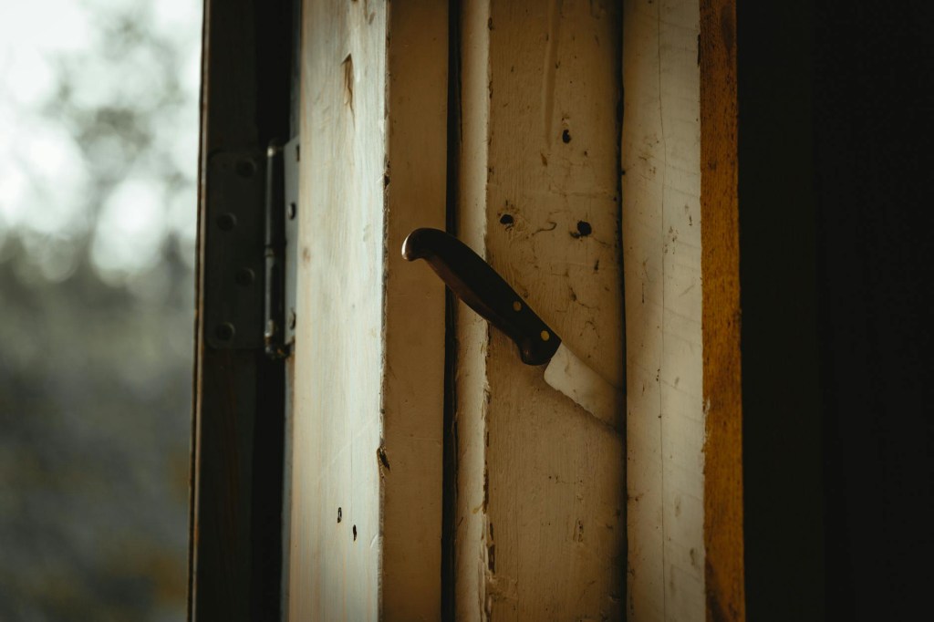 Levanta-se, coloca o facão próximo ao amolador e caminha para a porta.